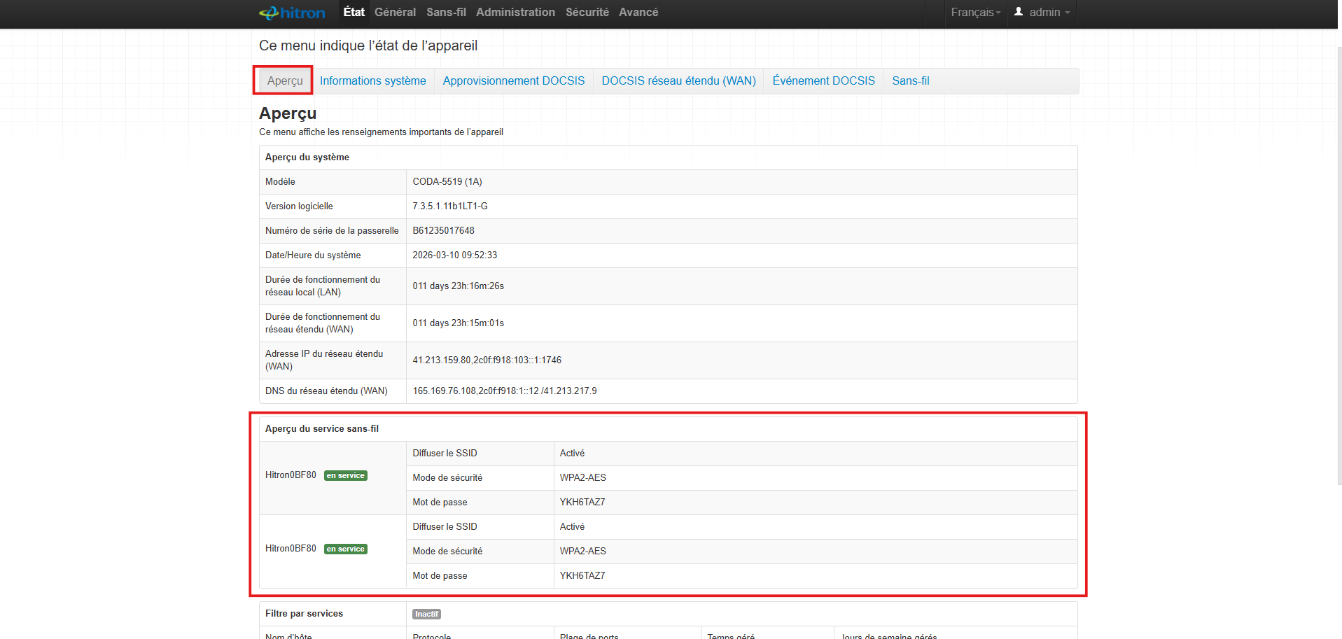 - Depuis le menu "Aperçu", j'identifie le tableau : "Aperçu du service sans-fil"